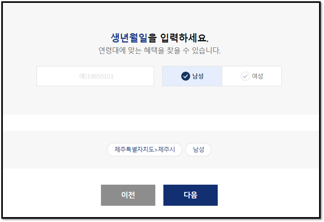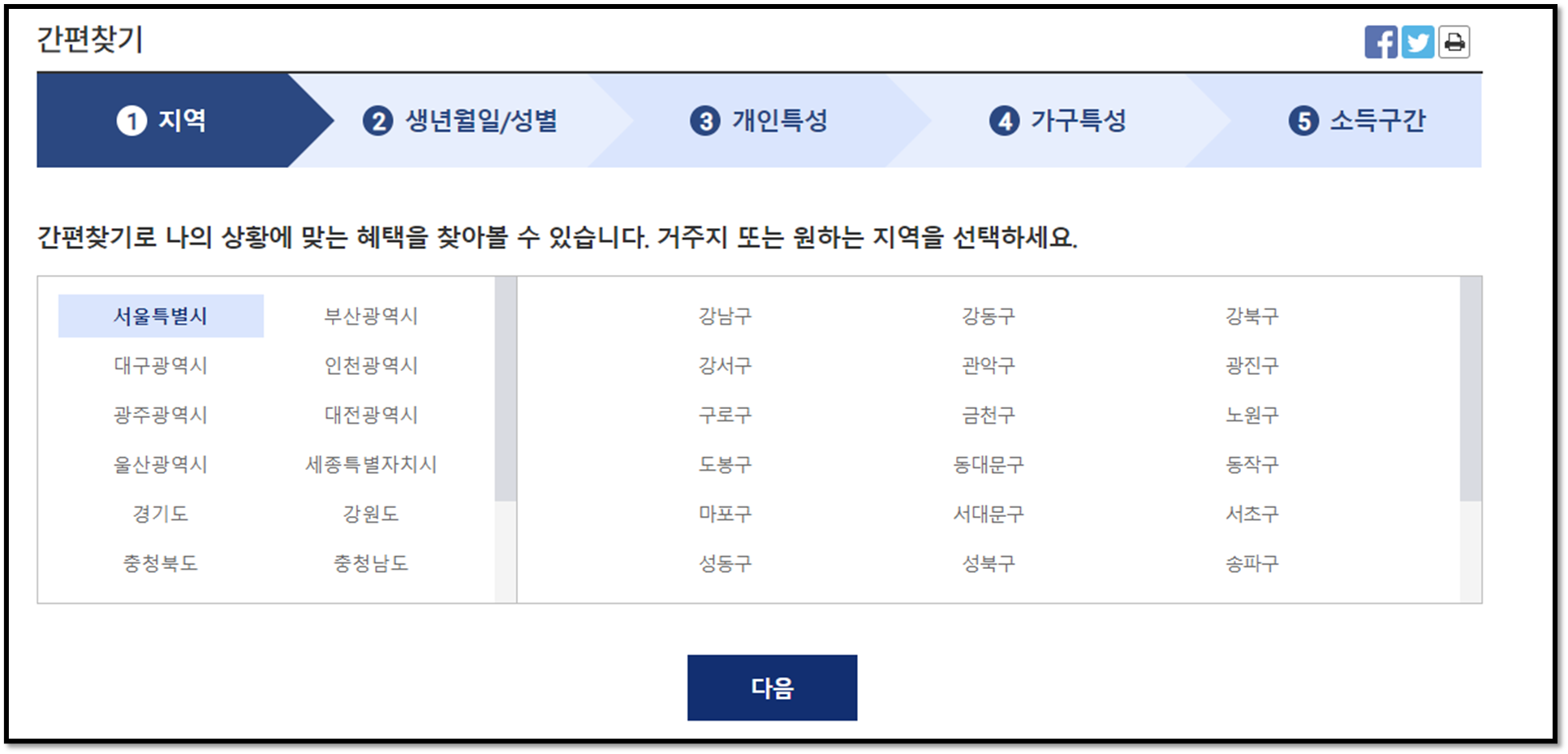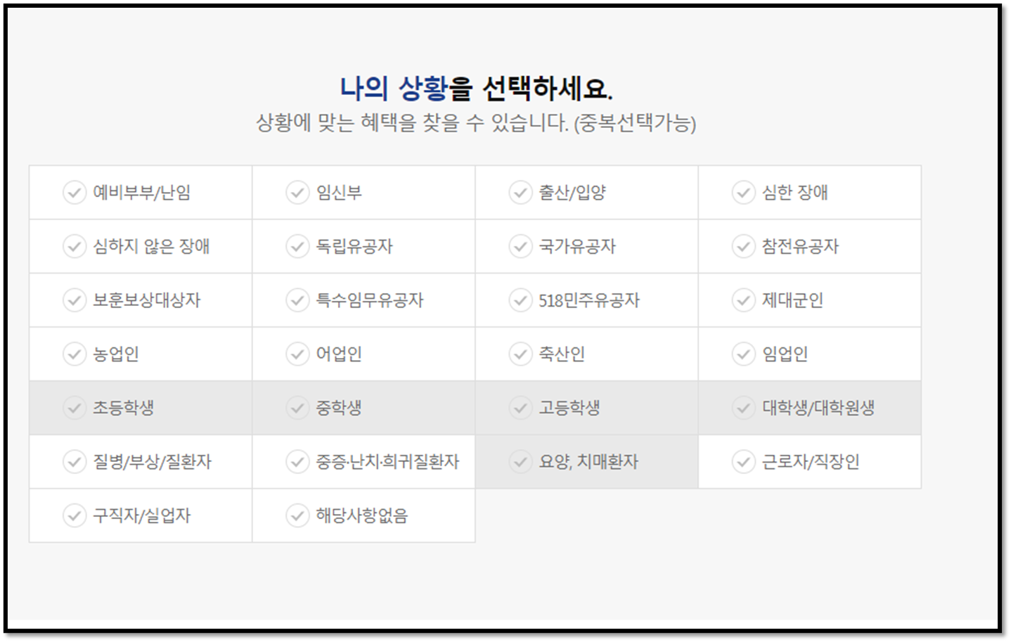 내가 사는 지역의 숨은정부지원금을 찾으려면 내가 사는 지역을 일단 클릭을 합니다. 그리고 생년월일과 성별을 입력하도록 되어있는데, 성별을 입력해야하는 이유를 저도 모르긴 합니다. 그런 후 나의 상황을 선택하여야 하는데, 상당히 많은 종류가 있습니다. 개인 특성이라고 보면 되는데 예비부부, 난임부부, 임산부, 출산, 입양, 장애, 독립유공자, 국가유공자, 제대 군인등을 선택할 수가 있게 되었어요. 중복가능합니다.