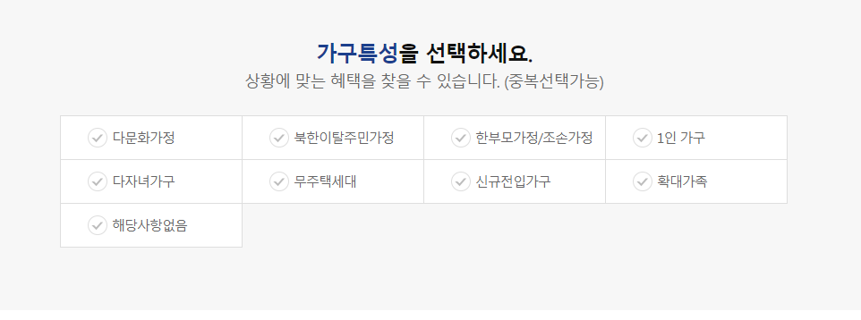 아. 제대군인을 선택해야하는 이유에서 성별이 필요했던 모양입니다. 그 다음에 선택을 하여야하는 것은 가구 특성입니다. 가구 특성이라고 하면 다문화가정, 북한이탈주민가정, 한부모 조손가정, 1인가고, 다자녀가구, 무주택세대, 신규전입가구, 확대가족, 해당사항없음등이 있습니다.